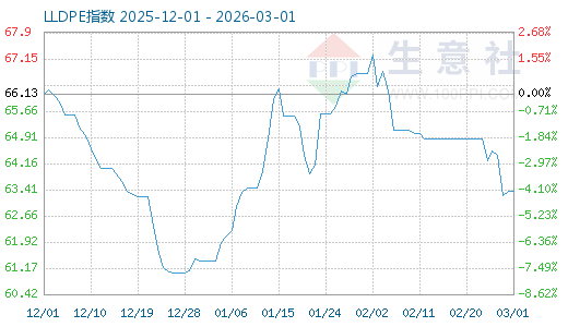 3月1日生意社LLDPE指數(shù)為63.37,與昨日持平,較周期內最高點117.56點(2013-12-11)下降了46.10%,較2020年04月06日最低點57.46點上漲了10.29%。(注:周期指2011-09-01至今)