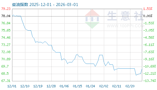 3月1日生意社柴油指數(shù)為69.35,與昨日持平,較周期內(nèi)最高點(diǎn)110.06點(diǎn)(2022-11-14)下降了36.99%,較2016年08月10日最低點(diǎn)55.05點(diǎn)上漲了25.98%。(注:周期指2011-09-01至今)