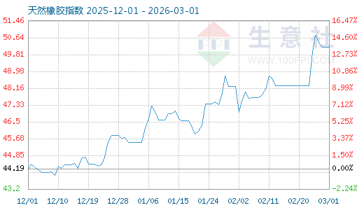 3月1日生意社天然橡膠指數(shù)為50.17,與昨日持平,較周期內(nèi)最高點(diǎn)100.00點(diǎn)(2011-09-01)下降了49.83%,較2020年04月02日最低點(diǎn)27.28點(diǎn)上漲了83.91%。(注:周期指2011-09-01至今)