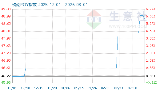 3月1日生意社錦綸POY指數(shù)為48.85,與昨日持平,較周期內(nèi)最高點(diǎn)102.03點(diǎn)(2012-10-28)下降了52.12%,較2025年11月30日最低點(diǎn)45.81點(diǎn)上漲了6.64%。(注:周期指2012-10-01至今)
