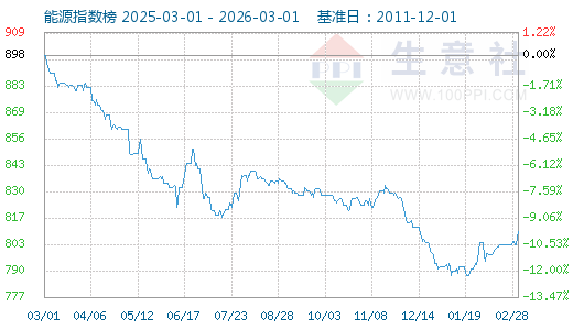 2月2日生意社能源指數(shù)為797點(diǎn),較昨日下降了7點(diǎn),較周期內(nèi)最高點(diǎn)1561點(diǎn)(2021-10-21)下降了48.94%,較2016年03月01日最低點(diǎn)511點(diǎn)上漲了55.97%。(注:周期指2011-12-01至今)