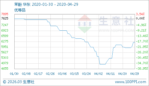 苯酚04月29日最新價格6225.00元/噸,最近5天上漲5.51%,20天上漲20.87%。