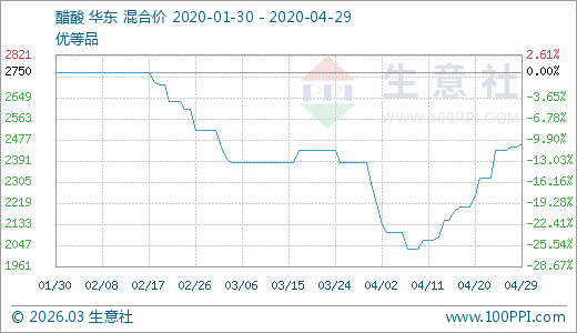 醋酸04月29日最新價格2463.33元/噸,最近10天上漲11.80%,20天上漲21.15%。
