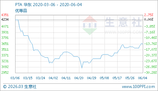 06月04日PTA價(jià)格3644.44元/噸 30天上漲10.73%