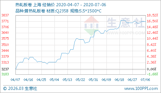 07月06日熱軋板卷3770.00元/噸 60天上漲12.37%