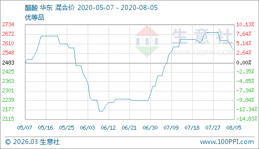 08月05日醋酸2566.67元/噸 60天上漲14.58%
