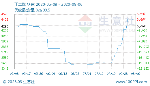 丁二烯08月06日最新價格4451.11元/噸,最近10天上漲12.50%,20天上漲28.15%。