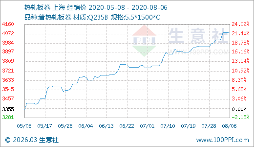 08月06日熱軋板卷4087.50元/噸 60天上漲12.37%