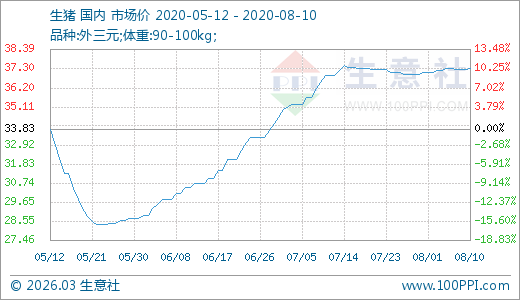 生豬08月10日最新價(jià)格37.32元/公斤,最近60天上漲22.36%。