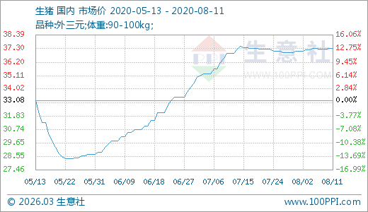 生豬08月11日最新價格37.32元/公斤,最近60天上漲21.56%。