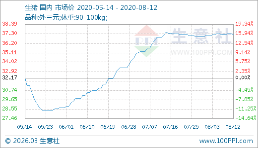 生豬08月12日最新價(jià)格37.23元/公斤,最近60天上漲21.27%。