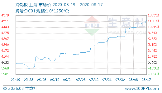 08月17日冷軋板4522.50元/噸 60天上漲10.10%