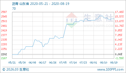 瀝青08月19日最新價格2530.00元/噸,最近60天上漲10.00%。