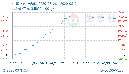 生豬08月24日最新價格37.02元/公斤,最近60天上漲10.90%。
