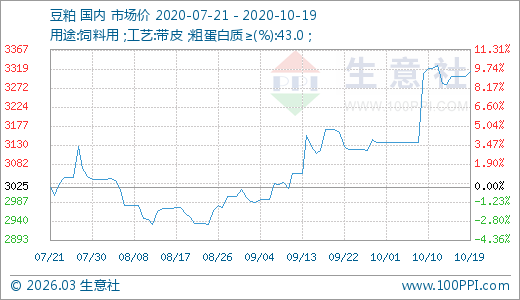 10月19日豆粕3312.50元/噸 60天上漲12.29%