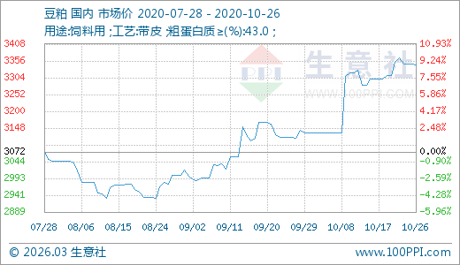 10月26日豆粕3345.00元/噸 60天上漲12.44%