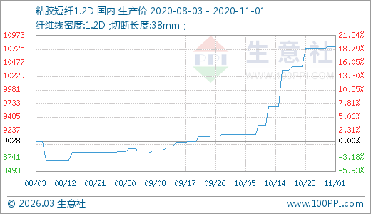 11月01日粘膠短纖10766.67元/噸 20天上漲11.23%