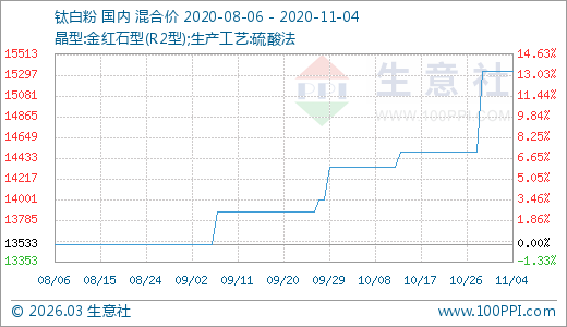 鈦白粉11月04日最新價格15333.33元/噸,最近10天上漲5.75%,60天上漲13.30%。