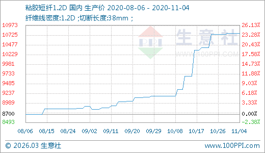 11月04日粘膠短纖10766.67元/噸 20天上漲11.23%