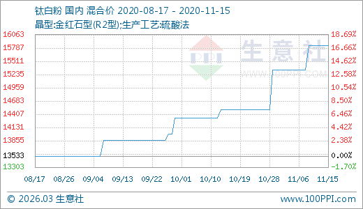 鈦白粉11月15日最新價格15833.33元/噸,最近20天上漲9.20%,60天上漲14.18%。
