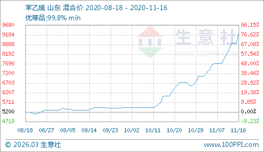 苯乙烯11月16日最新價格9266.67元/噸,最近5天上漲13.24%,10天上漲20.35%,20天上漲41.12%,30天上漲53.17%,60天上漲70.55%。
