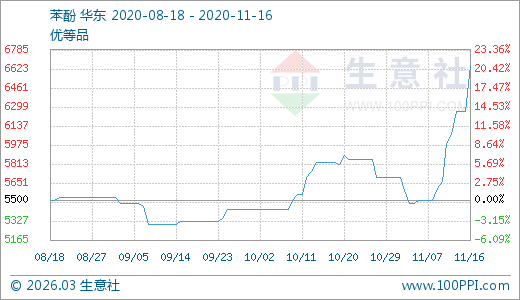 11月16日苯酚6500.00元/噸 5天上漲9.24%