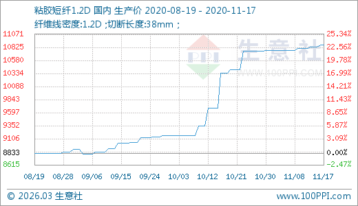 11月17日粘膠短纖10866.67元/噸 60天上漲20.21%