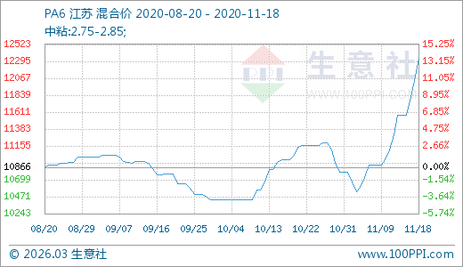 PA6 11月18日最新價(jià)格12333.33元/噸,最近5天上漲6.63%,10天上漲13.15%,60天上漲14.37%。