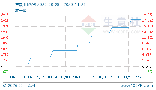 11月26日焦炭2017.50元/噸 60天上漲11.00%