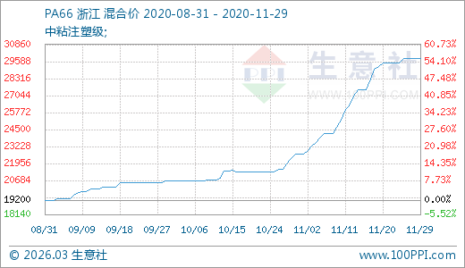 PA66 11月29日最新價格29800.00元/噸,最近20天上漲20.65%,30天上漲31.57%,60天上漲44.31%。