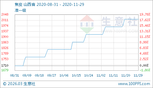 焦炭11月29日最新價(jià)格2017.50元/噸,最近60天上漲11.00%。
