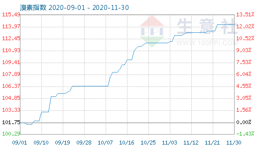 溴素商品指數(shù)自2020/7/19起,135天陸續(xù)上漲了23.894%。