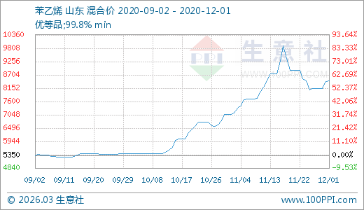 12月01日苯乙烯8450.00元/噸 5天上漲3.68%
