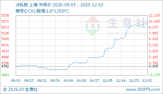 12月02日冷軋板5282.50元/噸 60天上漲11.80%