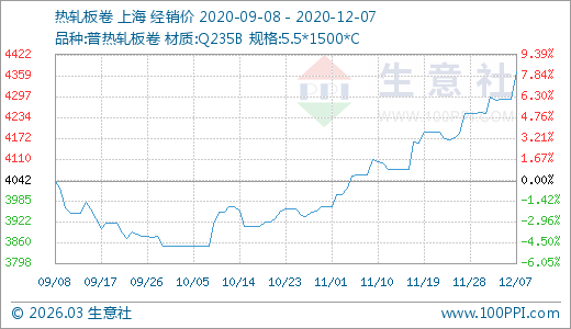 12月07日熱軋板卷4370.00元/噸 60天上漲13.51%