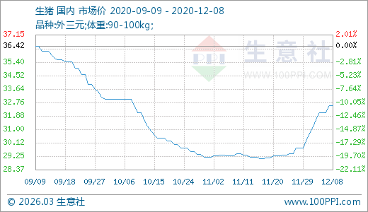 生豬12月08日最新價(jià)格32.53元/公斤,最近10天上漲9.23%,20天上漲11.67%。