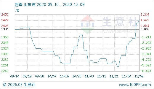 瀝青12月09日最新價格2432.50元/噸,最近10天上漲5.88%,20天上漲7.28%。