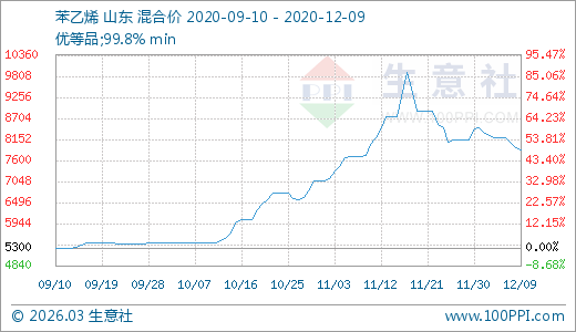 12月09日苯乙烯7866.67元/噸 60天上漲44.34%