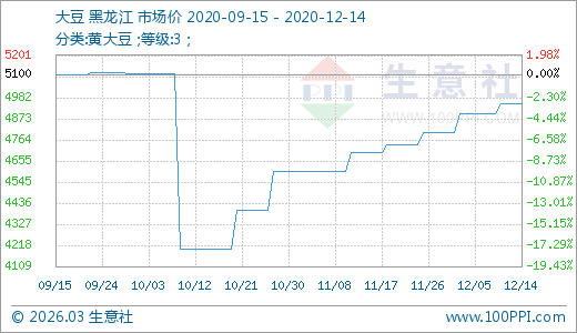 大豆12月14日最新價格4950.00元/噸,最近60天上漲17.86%。