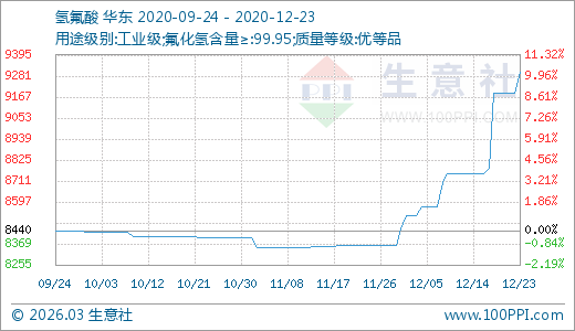 12月23日氫氟酸9300.00元/噸 10天上漲6.29%