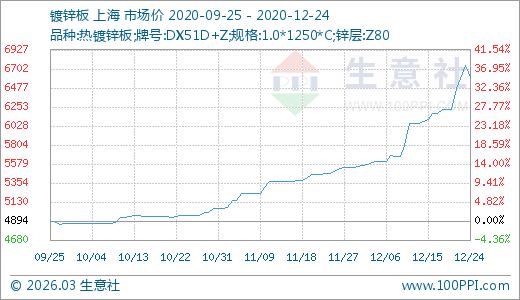 鍍鋅板12月24日最新價格6604.00元/噸,最近5天上漲6.21%,10天上漲8.65%,20天上漲17.68%,30天上漲20.69%,60天上漲32.98%。