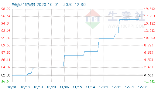 棉紗21S商品指數(shù)自2020/9/20起,102天陸續(xù)上漲了18.201%。