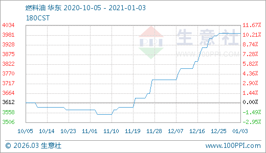 燃料油01月03日最新價格3990.00元/噸,最近60天上漲12.39%。