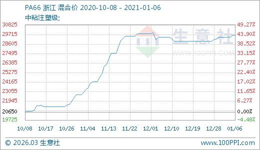 01月06日PA66價格29650.00元/噸 60天上漲22.52%