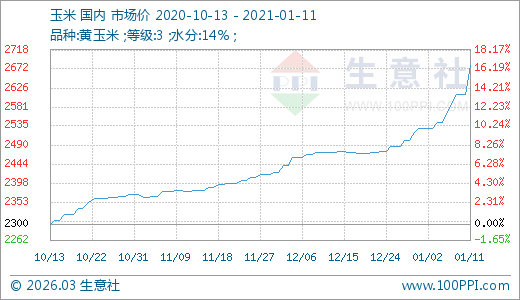 01月11日玉米2680.00元/噸 5天上漲4.51%