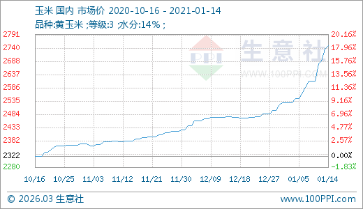 01月14日玉米2748.57元/噸 5天上漲5.25%
