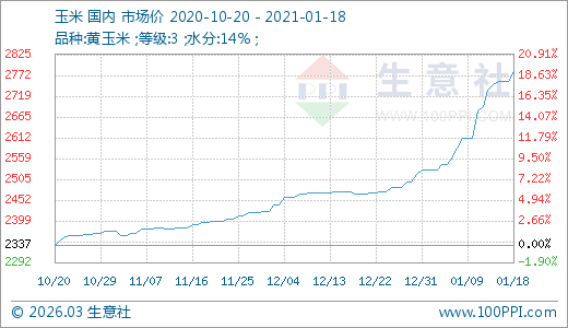 01月18日玉米2781.43元/噸 10天上漲6.51%