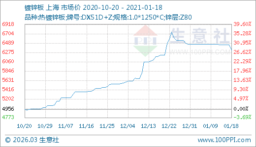 01月18日鍍鋅板6326.00元/噸 60天上漲16.93%
