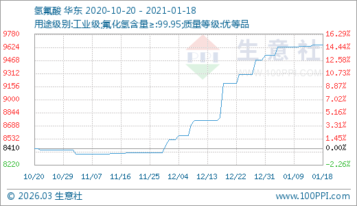 氫氟酸01月18日最新價格9650.00元/噸,最近60天上漲15.43%。
