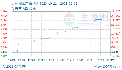 01月19日大豆5300.00元/噸 60天上漲11.81%